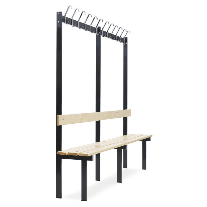 Praktisk bænk med integreret knagerække med 12 kroge i forniklet stål. 200 cm bred. Sædet er fremstillet af lakeret fyrretræ, mens stellet er sort og robust. Stellet består af svejste firkantrør, der er pulverlakeret i RAL 9005.