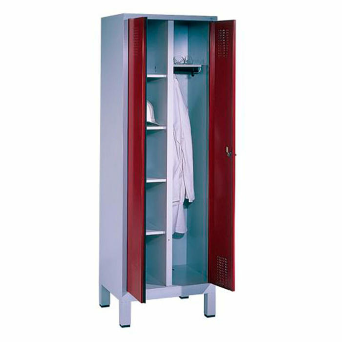 Rummeligt omklædningsskab med iøjnefaldende røde låger. Skabet har et praktisk dobbeltrum og inkluderer en hattehylde, bøjlestang samt fire faste hylder. Konstruktionen er svejset for ekstra holdbarhed. Dørgrebene er designet til at kunne anvendes med hængelås for ekstra sikkerhed. Skabet bliver leveres samlet og klar til brug.