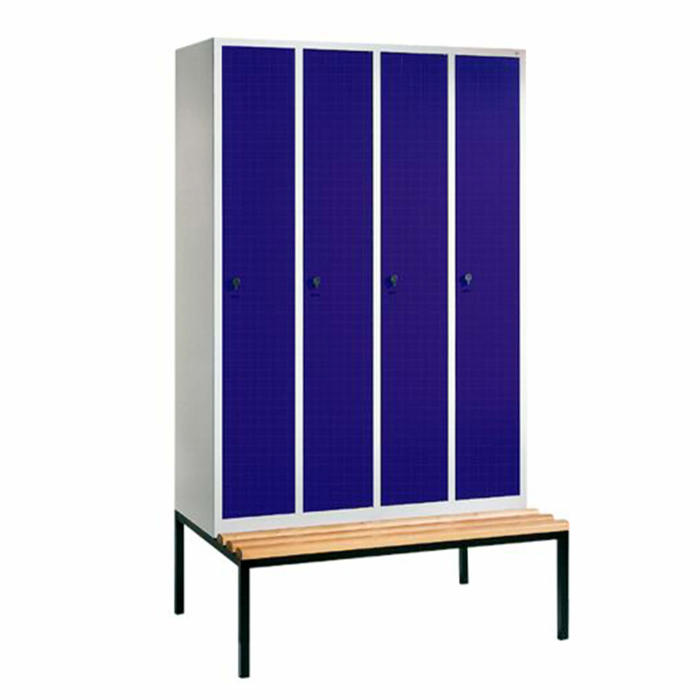 Omklædningsskab med bænk og 4 rum er lavet i et holdbart og svejset ståldesign. Dørene er fremstillet af stål og har god ventilation, hvilket gør det praktisk at bruge. Skabet tilbyder større beskyttelse mod indbrud takket være de ekstremt warp-resistente døre. Dørene er højrevendte og udstyret med pivot hængsler, hvilket gør dem nemme at rengøre.