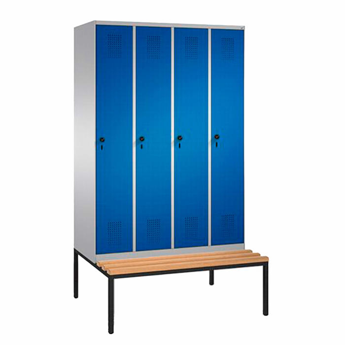 Evolo omklædningsskab med bænk og fire rum er en praktisk og stilfuld løsning til opbevaring. Skabet måler 209 cm i højden, 120 cm i bredden og 81,5 cm i dybden, hvilket giver rigelig plads til dine ejendele. Bænken er integreret i skabets bund og har en dybde på 31,5 cm, hvilket gør det nemt at sidde og tage sko på. Lysmålet er 160 cm i højden, 23 cm i bredden og 46,5 cm i dybden. Indvendigt finder du en hylde og en bøjlestang med tre kroge, der giver fleksible opbevaringsmuligheder Leveres samlet.