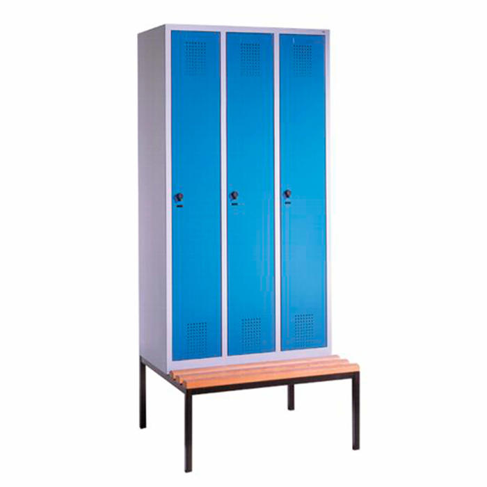 Omklædningsskab med en praktisk bænk og tre rum, alt sammen i et holdbart og svejset ståldesign. Dørene er lavet af stål og sikrer god ventilation. . Skabet har højrevendte døre med pivot hængsler, som gør det nemt at rengøre. Der er også hulmønster og mulighed for nummerering.