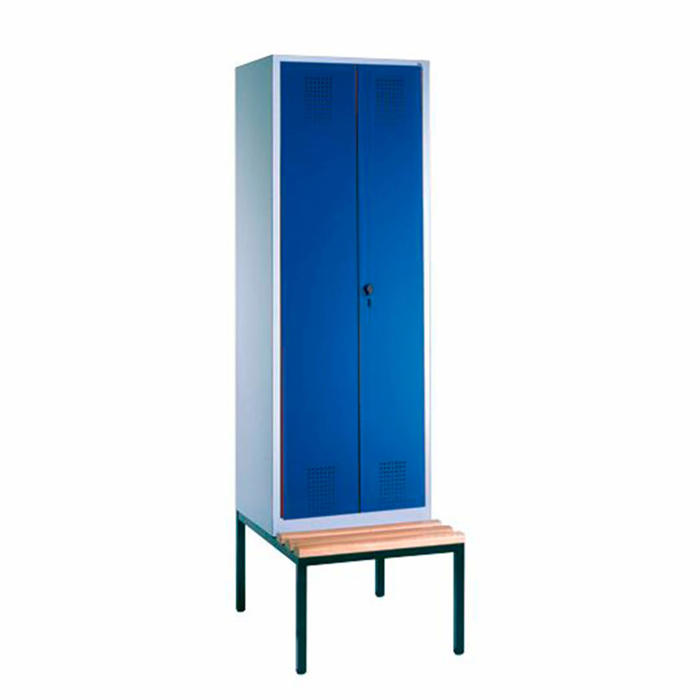 Omklædningsskab med en praktisk bænk og to rummelige sektioner, alt sammen i et robust og svejset ståldesign. Skabets døre er lavet af stål og har god ventilation, hvilket gør det ideelt til opbevaring af tøj og udstyr. Den praktiske indretning giver større beskyttelse mod indbrud takket være de ekstremt warp-resistente døre, som lukker i midten med pivot hængsler. Skabet er nemt at rengøre og har et hulmønster samt mulighed for nummerering.