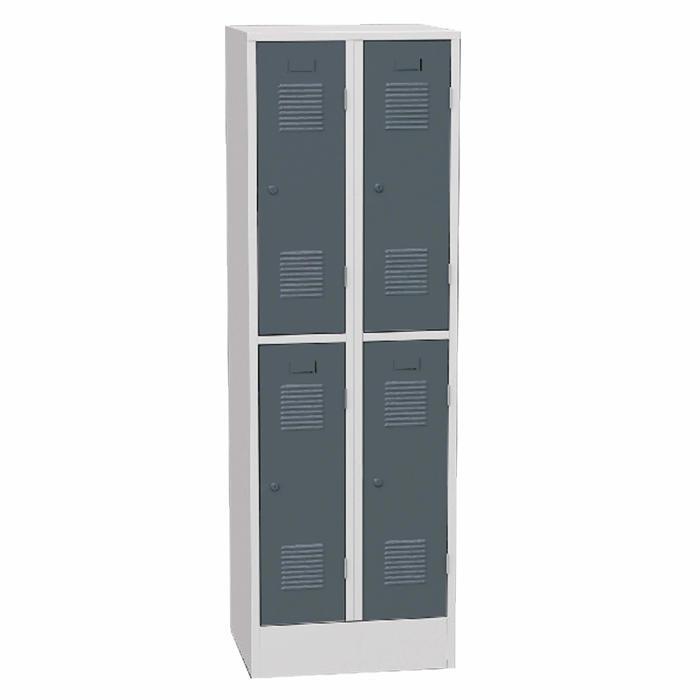 Dette er designet med 2x2 låger og kommer i en kombination af lysegråt kabinet og mørkegrå låger. Hvert rum i skabet er udstyret med tre kroge og en hylde, hvilket giver god opbevaringsplads. Lågerne har ventilationsriller i både top og bund, et navneskilt og en selvstændig lås, der kun passer til én nøgle. Der medfølger to nøgler pr. lås. Skabet kan også tilpasses med en bænk, andre låsesystemer og skråt tag.