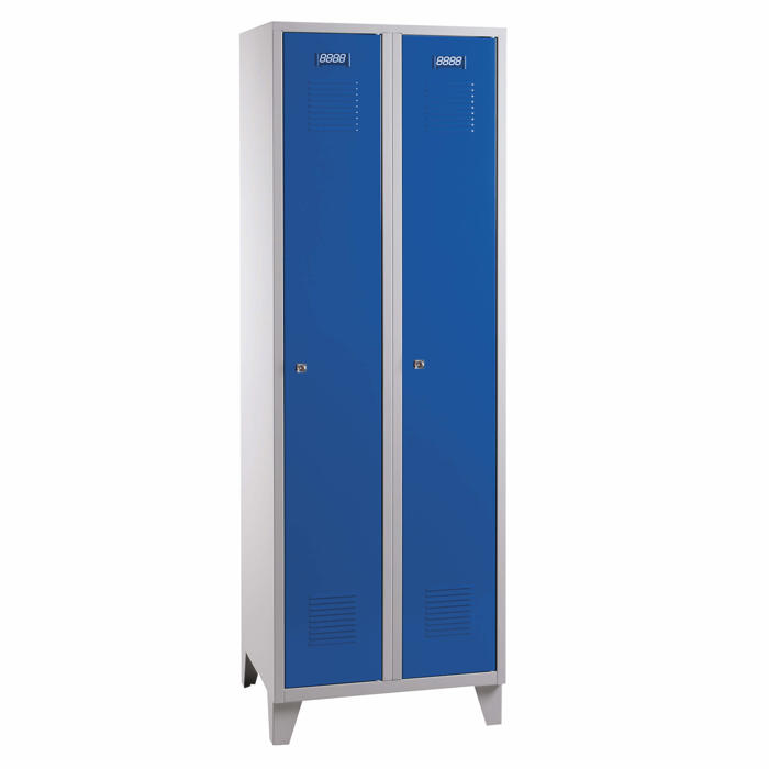 Praktisk omklædningsskab med to separate rum. Skabet er udstyret med ventilationsåbninger både øverst og nederst på lågerne, hvilket sikrer god luftcirkulation. Indvendigt finder du en hattehylde, en bøjlestang og en håndklædekrog, som gør det nemt at organisere dine ejendele. Skabet er forsynet med en cylinderlås for sikker opbevaring. Leveres samlet og klar til brug.