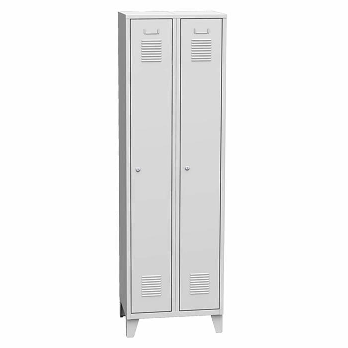 Praktisk omklædningsskab med to separate rum. Skabet er udstyret med ventilationsåbninger både øverst og nederst på lågerne, hvilket sikrer god luftcirkulation. Indvendigt finder du en hattehylde, en bøjlestang og en håndklædekrog, som gør det nemt at organisere dine ejendele. Skabet er forsynet med en cylinderlås for sikker opbevaring. Leveres samlet og klar til brug.