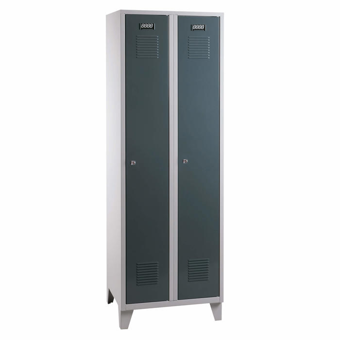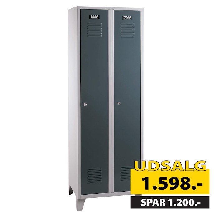 Praktisk omklædningsskab med to separate rum. Skabet er designet med ventilationsåbninger både øverst og nederst på lågerne, hvilket sikrer god luftcirkulation. Indvendigt finder du en hattehylde, en bøjlestang og en håndklædekrog, som gør det nemt at organisere dine ejendele. Udstyret med en sikker cylinderlås. Leveres færdigsamlet og klar til brug.