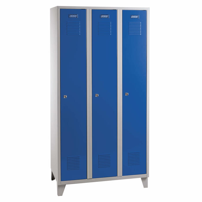 omklædningsskab med tre separate rum. Skabet er udstyret med ventilationsåbninger både øverst og nederst på lågerne. Indvendigt finder du en praktisk hattehylde, en bøjlestang til ophængning af tøj samt en håndklædekrog. Skabet er sikret med en cylinderlås og leveres samlet og klar til brug.