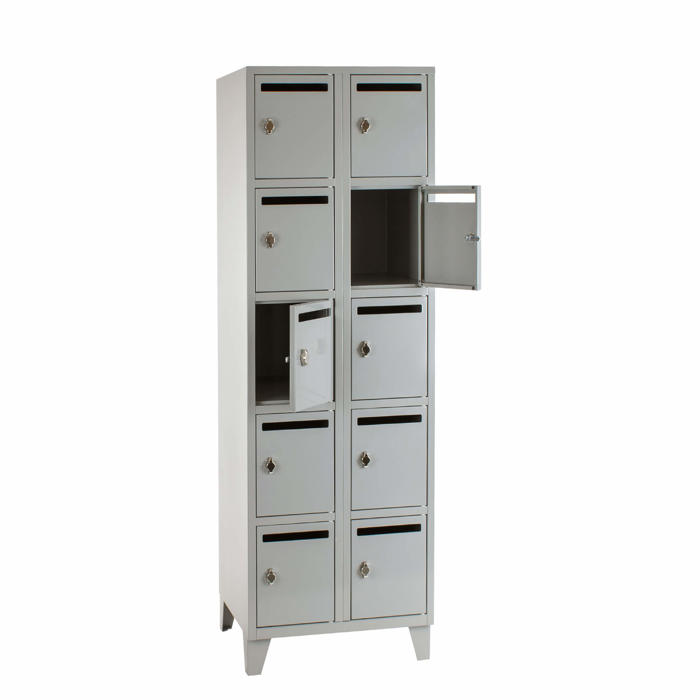 Denne helsvejste personaleboks står på ben og har 2x5 rum. Hvert rum er udstyret med brevindkast og greb, der passer til hængelås. Den leveres samlet og klar til brug, så du kan tage den i brug med det samme.