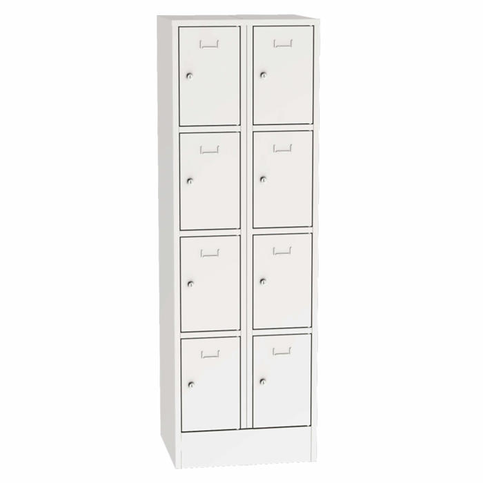Denne personaleboks har 2x4 rum, hver med en cylinderlås og to nøgler. Den står på en sokkel og har en navneskilt-holder i hver låge.