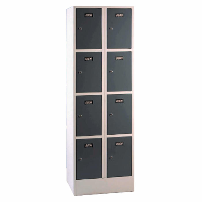 Personaleboks med 2x4 rum, hver udstyret med cylinderlås og to nøgler. Boksen står på en sokkel og har navneskilt-holdere på hver låge. Samlet og klar til brug ved levering.