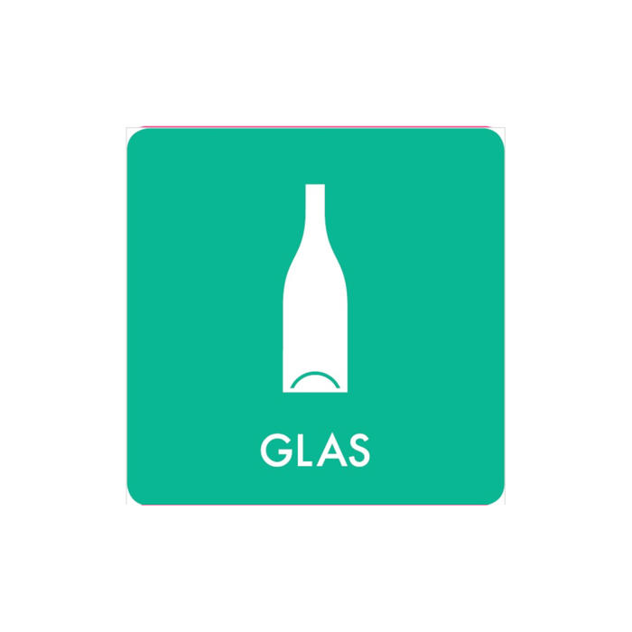 Pictogrammet har afrundede hjørner og er markeret med teksten 'GLAS', hvilket gør det tydeligt og let at forstå. Det er ideelt til at organisere affald korrekt og sikre, at glasaffald bliver sorteret rigtigt.