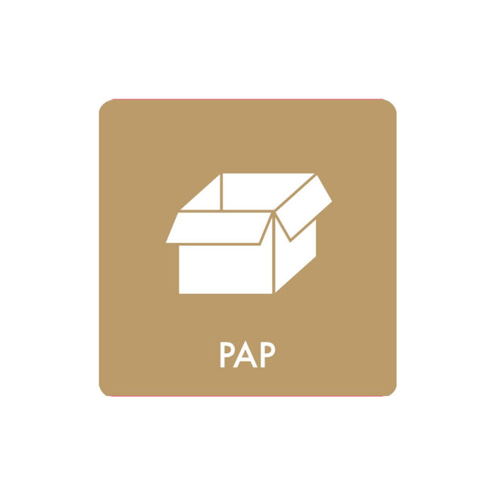 Pictogrammet har teksten 'PAP', hvilket gør det nemt at identificere papiraffald. Det er en praktisk løsning til at forbedre affaldssorteringen i hjemmet eller på arbejdspladsen.