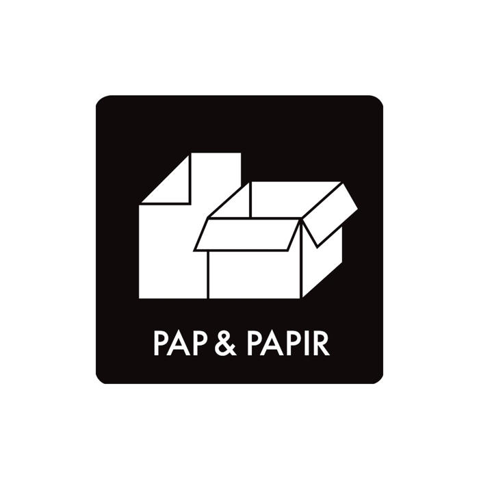 Pictogrammet har teksten 'PAP & PAPIR', hvilket gør det ideelt til at markere områder for papir- og papaffald. Det er en enkel måde at organisere affaldssorteringen på og sikre, at papir og pap bliver korrekt sorteret.