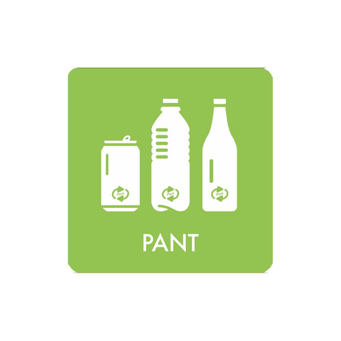 Pictogrammet har teksten 'PANT', hvilket gør det nemt at identificere og organisere affald korrekt. Det er en praktisk løsning til både private og offentlige områder, hvor affaldssortering er vigtig.