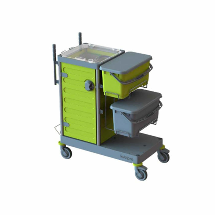 Vores rengøringsvogn er designet til at gøre rengøringen nemmere og mere effektiv. Den kommer med et aflåseligt skab, så du kan opbevare dine rengøringsmidler sikkert. Vognen inkluderer også fire farvekodede spande på 6 liter hver og to større spande på 25 liter. Den er udstyret med ergonomiske håndtag og gummihjul, der kan låses for ekstra stabilitet.