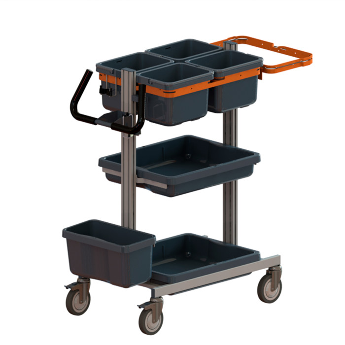 Taski Nano Hotel Trolley er en lille rengøringsvogn, der er ideel til mellemstore rengøringsområder. Den er nem at manøvrere takket være håndtagene og de låsbare hjul. Vognen er udstyret med 4 spande, 2 skuffer, en moppeboks og en affaldsholder, hvilket gør den praktisk og funktionel.