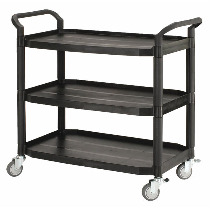Dette rullebord i sort superplast kommer med tre hylder og søjler af aluminium. Det kan bære op til 250 kg og har fire drejelige hjul, hvoraf to er udstyret med bremser. Afstanden mellem hylderne er 29,3 cm, og der er håndtag i begge ender, hvilket gør det nemt at manøvrere. Bordet leveres usamlet.