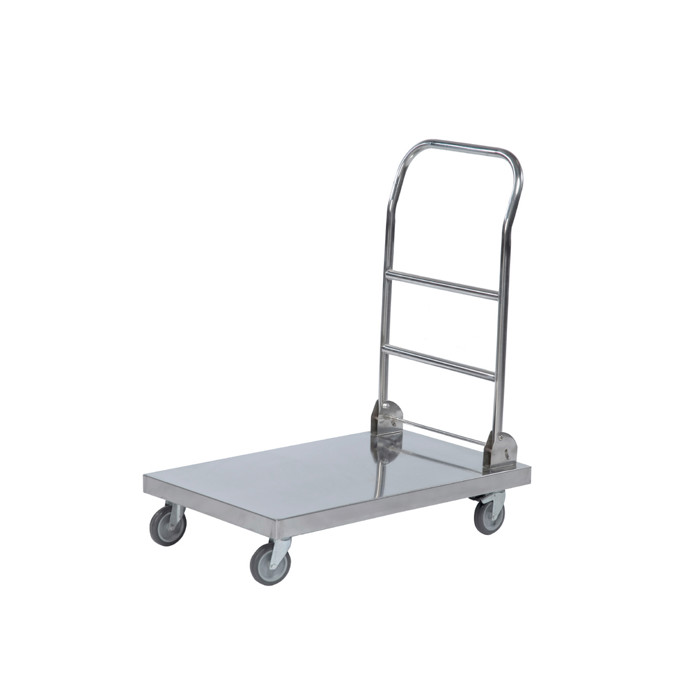 Denne rustfri plateauvogn er praktisk og kan nemt klappes sammen, når den ikke er i brug. Vognen er udstyret med fire svingbare hjul, hvoraf to kan låses, hvilket giver ekstra stabilitet under brug. Hjulene har en diameter på 10 cm, hvilket gør det nemt at manøvrere vognen rundt.