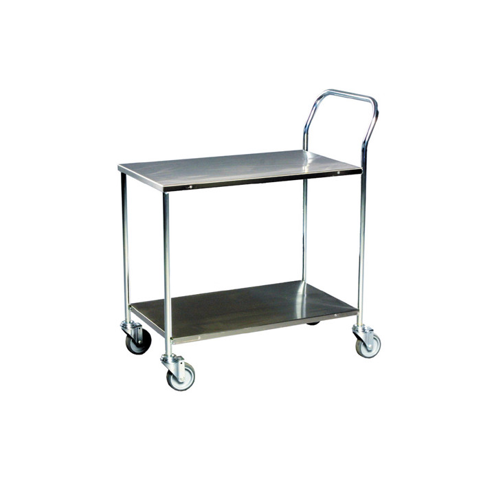 Vores serveringsvogn er designet med en robust ramme i elforzinket stål og hyldeplader, der er dækket med 1 mm rustfri plade. Vognen er udstyret med fire svingbare hjul, der har en diameter på 10 cm, hvilket gør den nem at manøvrere rundt.