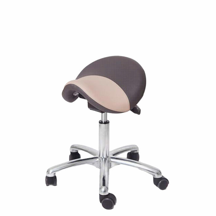 Sadelformet sæde betrukket med grå og sand Stamskin i høj kvalitet. Donald-stolen har en balance-mekanisme, der opfordrer brugeren til at bevæge sig i alle retninger. Dette giver mere fleksibilitet i rygsøjlen og forbedrer siddekomforten.