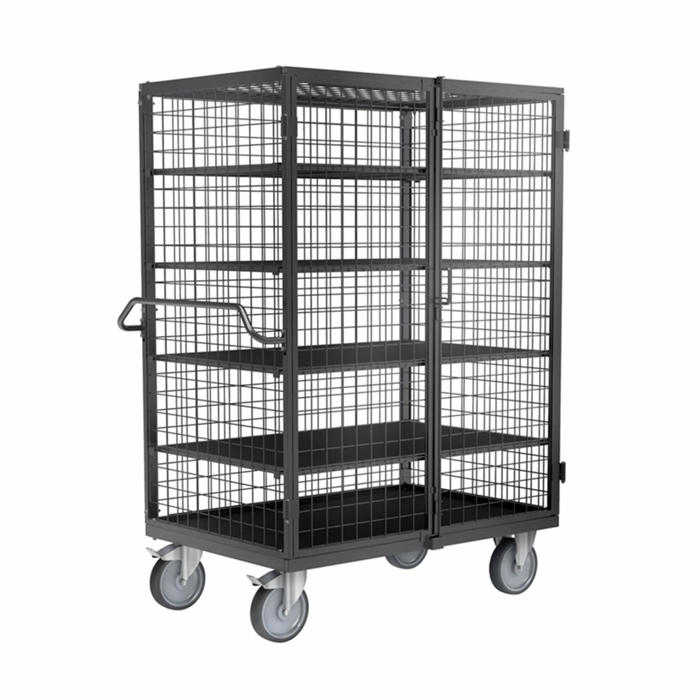Ergo sikkerhedsvognen er udstyret med letløbende hjul, hvilket betyder, at det kræver mindre anstrengelse at køre med den. De to låsbare låger sikrer, at dine ting er godt beskyttet, mens det ergonomiske håndtag giver flere grebsmuligheder for øget komfort.