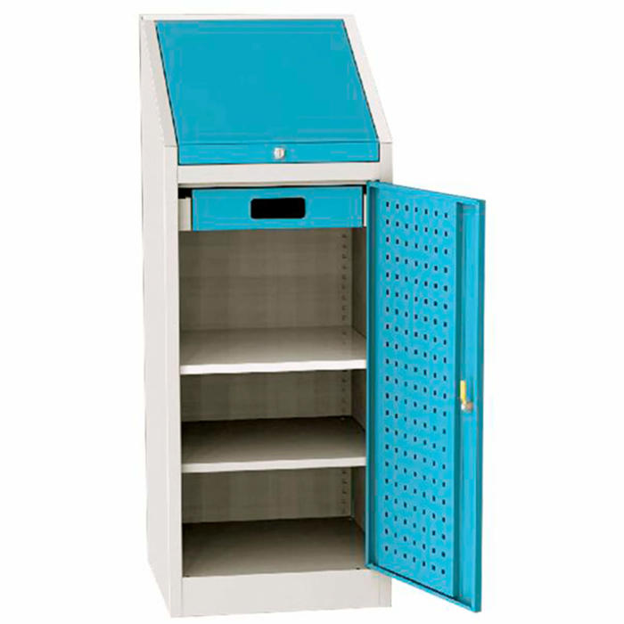 Dette værkstedsskab er designet til at modstå daglig brug og har en lang levetid. Skabet er udstyret med en låsbar låge, der har en indvendig hulplade, to hylder og en skuffe. Der medfølger også en cylinderlås for ekstra sikkerhed. Skabet kommer med et gråt kabinet og blå skuffer og låger.