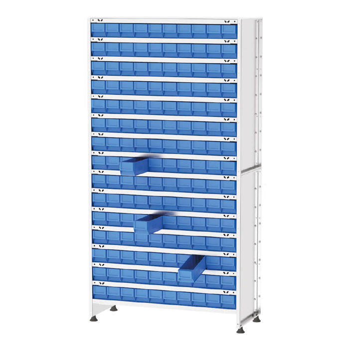 Hi-Max reolen er designet med 15 hylder og inkluderer 150 blå kasser. Reolen har en åben front, hvilket gør det nemt at få adgang til kasserne, som kan hænge på kanten af hylderne.