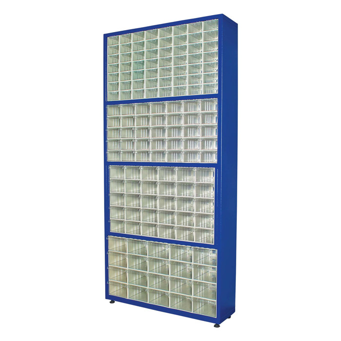 Hi-Max lagerreol/plukreol kommer med 141 klare plasticskuffer, der giver et godt overblik. Skufferne er lavet af robust, gennemsigtigt plastic og er ideelle til forskellige opbevaringsbehov inden for lager, auto og industri. Reolen er fremstillet i solidt stål og står stabilt på fire plasticfødder.