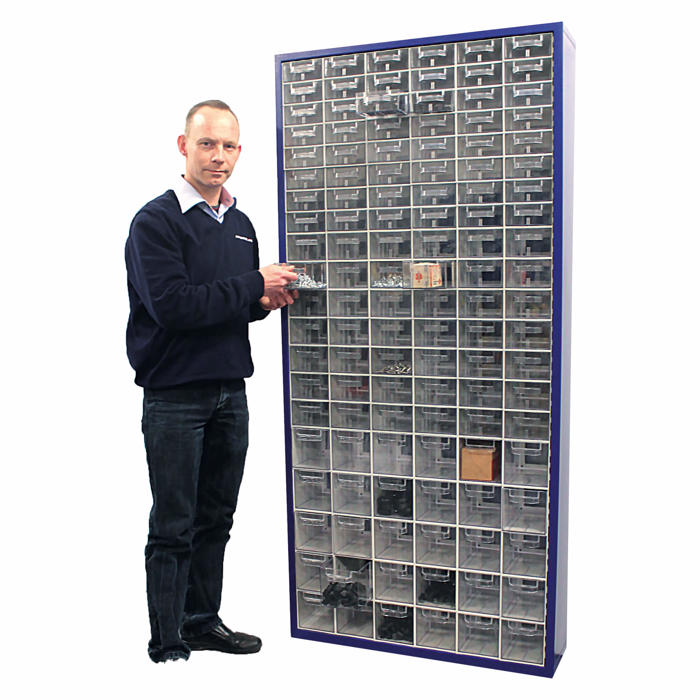 Denne Hi-Max skuffereol kommer med 120 klare småskuffer og et blåt kabinet. Den er perfekt til opbevaring og plukning af smådele. Reolen måler 84 cm i bredden, 21 cm i dybden og 186 cm i højden.