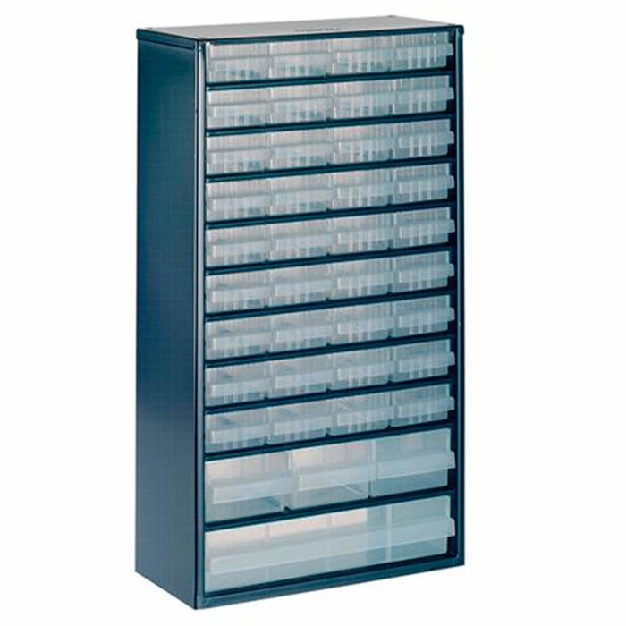 Her får du en praktisk skuffereol med 40 forskellige skuffer, der gør det nemt at holde styr på dine ting. Kabinettet er lavet af lakeret stål, mens skufferne er fremstillet i holdbar PP plast. Denne skuffereol er ideel til både hjemmet og værkstedet, hvor du har brug for en organiseret opbevaringsløsning.