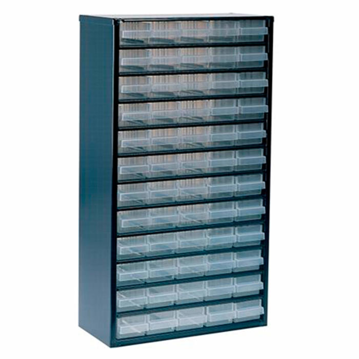 Hold styr på dine småting med denne skuffereol, der har hele 60 skuffer. Kabinettet er lavet af lakeret stål, mens skufferne er fremstillet i holdbar PP plast. Det gør den både robust og praktisk til opbevaring.