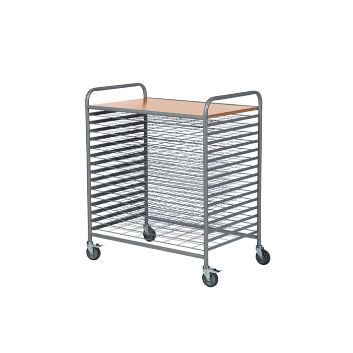Denne trådvogn er designet med et grålakeret stel og har en øverste hylde i bøgelaminat. Nethylderne kan nemt flyttes rundt og er ideelle til at tørre børns tegninger på. Vognen kan bære op til 100 kg og leveres usamlet.