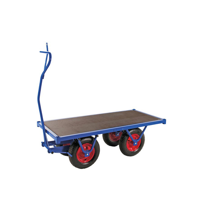 En trækvogn er ideel til at transportere, plukke og pakke tunge materialer. Den er lavet af et pulverlakeret stålrørsstel i blå farve og har en bund af krydsfinér. Håndtaget er udstyret med en bremse, og vognen har luftgummihjul på stålfælge med en diameter på 40 cm.