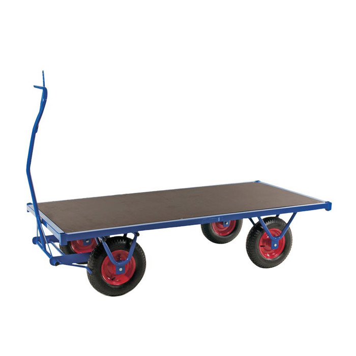 Dette produkt er lavet af et robust pulverlakeret stålrørsstel i en flot blå farve og har en bund af krydsfinér. Det er udstyret med et håndtag med bremsefunktion og luftgummihjul monteret på stålfælge med en diameter på 40 cm. Produktets dimensioner er 70x250 cm, og det kan bære op til 1500 kg.
