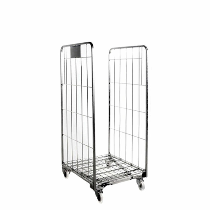 Dette stabelbare rullecontainerer designet til at spare plads, når det ikke er i brug. Bunden kan slås op, så burene kan køres ind i hinanden. Det leveres elforzinket og kommer med to vægge og fire hjul, hvoraf to er faste og to er svingbare med en diameter på 10 cm.