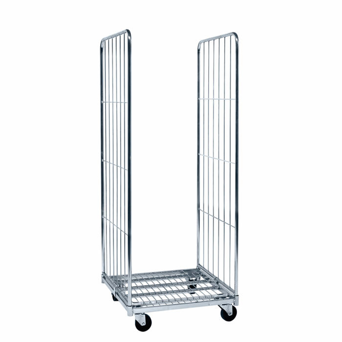 Rullecontainer med dobbeltvægge. Fremstillet i elforzinket materiale. Udstyret med fire hjul, hvoraf to er svingbare og to er faste, med en diameter på 10 cm. Kan samles uden brug af værktøj. Maksimal belastning: 400 kg. Åbning på 72 cm på siderne.