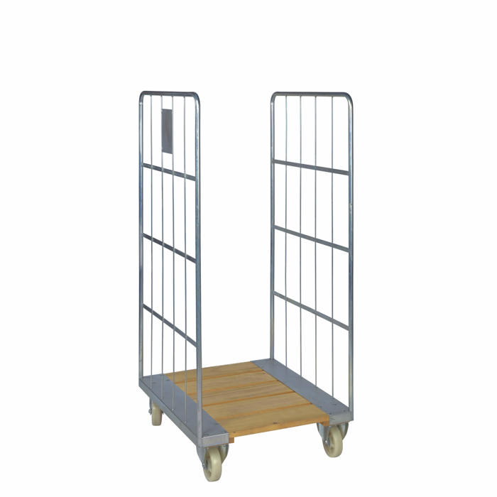 Rullecontainer med robust træbund og to solide vægge. Dette bur er elforzinket for ekstra holdbarhed. Udstyret med fire hjul, hvoraf to er svingbare og to er faste, med en diameter på 12,5 cm. Kan nemt samles uden brug af værktøj. Maksimal belastning er 400 kg. Åbning på den 71 cm brede side.