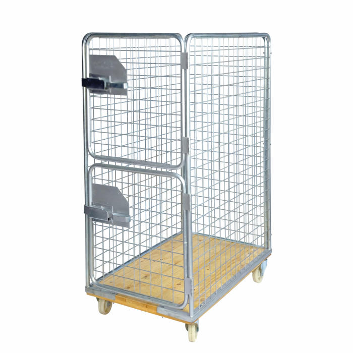 Rullecontainer med robust træbund, tre solide vægge og en praktisk låge. Dette bur er elforzinket for ekstra holdbarhed. Udstyret med fire hjul, hvoraf to er svingbare og to er faste, med en diameter på 12,5 cm. Kan nemt samles uden brug af værktøj. Maksimal belastningskapacitet er 800 kg. Åbning på 75 cm siden.