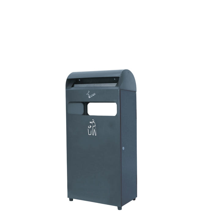 Stor skraldespand med indbygget askebæger, der passer godt til placering i parker, ved bænke og foran indgange. Den er designet til at være praktisk og nem at bruge.