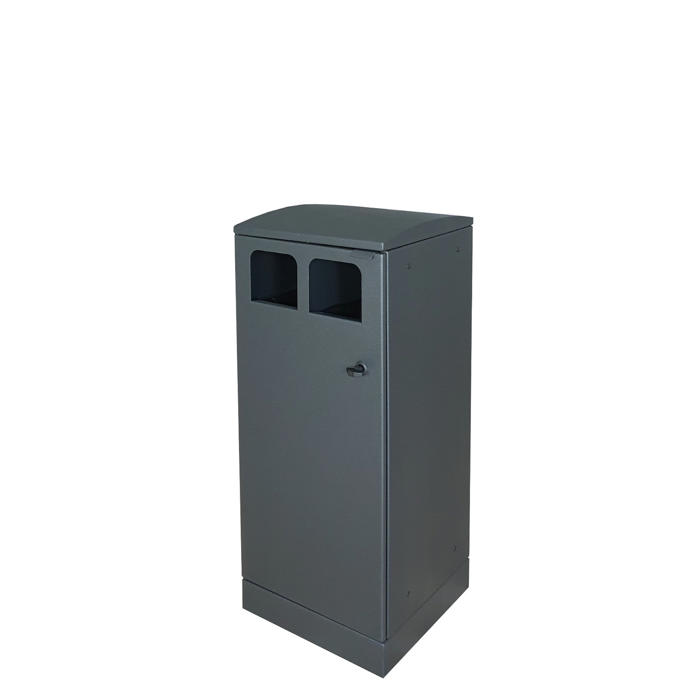 Denne udendørs affaldsbeholder har to indkast og en låsbar frontlåge, der gør det nemt at tømme den.