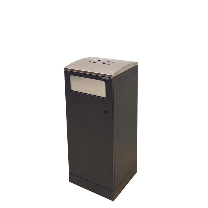 Robust udendørs affaldsbeholder med 2-sidet indkast. Den låsbare frontlåge gør det nemt at tømme beholderen. Top og sokkel er lavet af rustfrit stål, mens selve beholderen er udført i galvaniseret stål. Affaldsbeholderen kan fastgøres til underlaget og har en kapacitet på 100 liter. Kan kombineres med model 5079, 711, 712 og 713 for at skabe en større kildesorteringsstation med det ønskede antal fraktioner. Se udvalget af udendørs skraldespande husk også pictogrammer