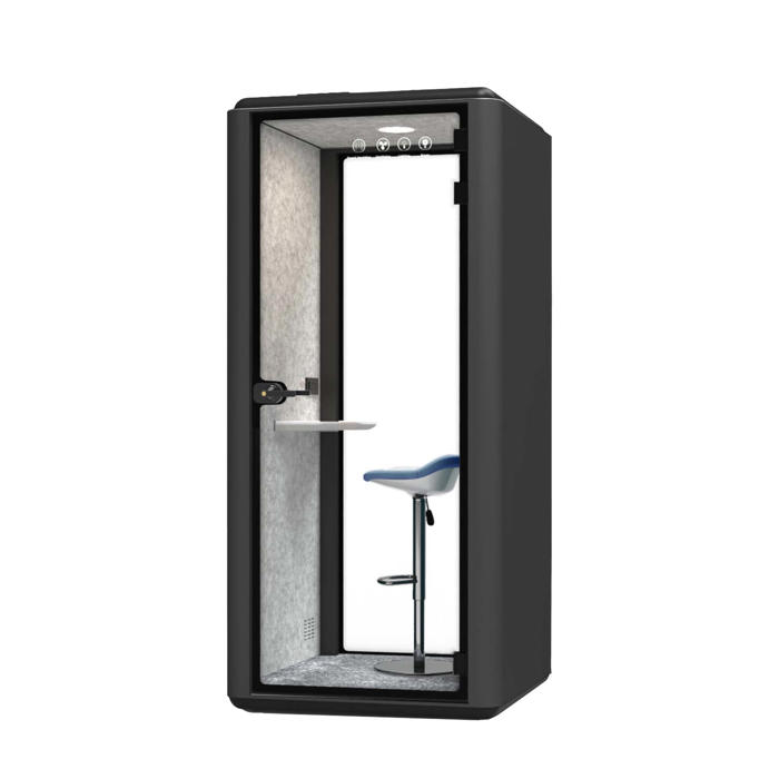 Telefonboks, der fungerer som stillerum, er ideel til storrumskontorer. Furnitechs telefonboks har plads til 1 person. Telefonboksens indvendige beklædning med lyddæmpende polyester på væggene og 12mm tykt bomuldstæppe på gulvet giver effektiv lyddæmpning og reducerer udefrakommende støj med op til 32 dB. Når du lukker døren, bliver Furnitech mødeboksen dit private møderum, kontor eller telefonboks, der giver plads til dyb koncentration og uforstyrrede møder. Boksen leveres med udslåelige hjul, hvilket gør den fleksibel og nem at flytte rundt på kontoret.