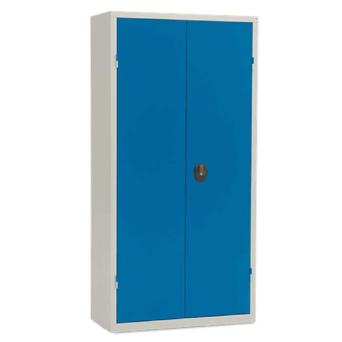 Materialeskab med fire justerbare hylder. Dette aflåselige skab har fire galvaniserede hylder, der kan flyttes efter behov, samt dørgreb og en skjult dobbelt skinnelås. Kabinettet er lysegråt med blå låger.