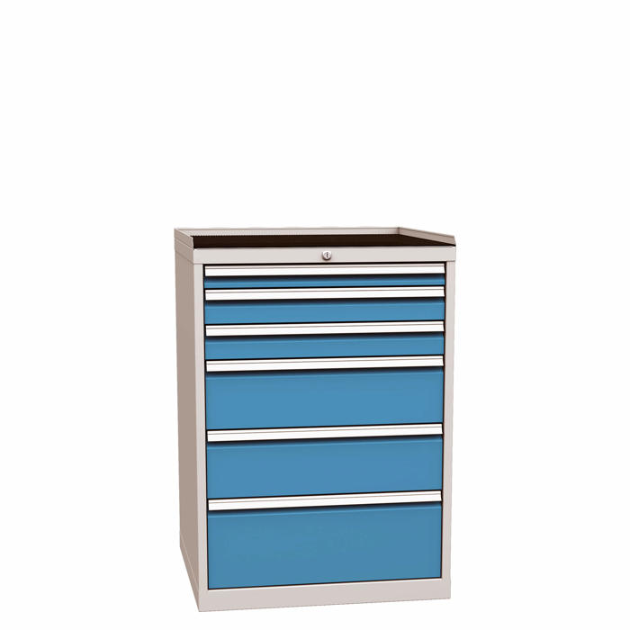 Skabet kommer med 6 skuffer, centrallås og en topplade med skridsikker gummibelægning. Det leveres med et gråt kabinet og blå skuffer og låger.