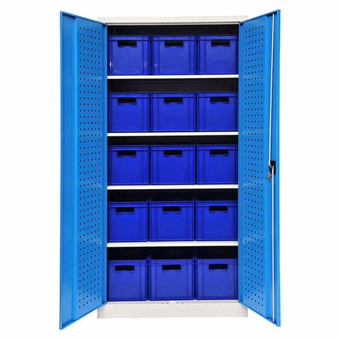 Unimax værktøjsskab fremstillet i robust svejset stålplade, komplet med eur-kasser. Skabet byder på: - Hulplade integreret i lågerne - 6 justerbare hylder med 25 mm intervaller - Sikker cylinderlås fra BURG.