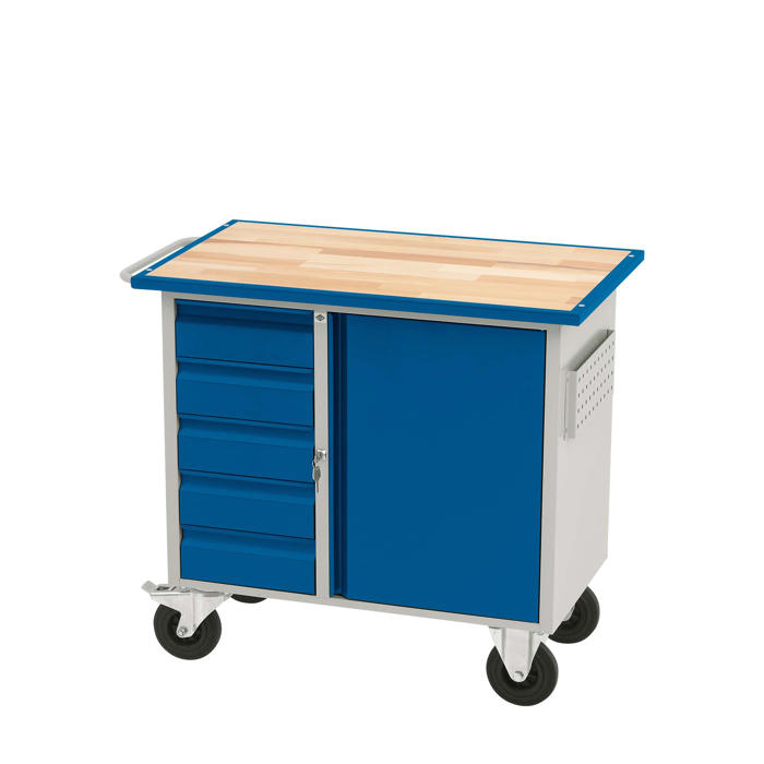 VV-3 værkstedsvognen kommer med en bordplade i bøgeparket og en stålramme. Den er udstyret med 2 faste hjul og 2 drejelige hjul med bremse, hvilket gør den nem at flytte rundt. Vognen har 5 skuffer med stålkugleudtræk og skuffespærre, så du kan trække skufferne ud enkeltvis. Der er også en skabssektion med en dør i dobbeltplade og en værktøjstavle på indersiden. Skabet indeholder en flytbar, galvaniseret hylde.