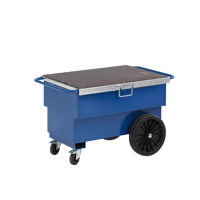Her er en værktøjsvogn, der er lavet af 1,5 mm tyk blåmalet stålplade. Låget er fremstillet af 2 mm aluzink plade og har en 10 mm træplade på toppen. Den er udstyret med en stærk låsebolt, som kan sikres med en hængelås (ikke inkluderet). Vognen har en volumen på 300 liter.
